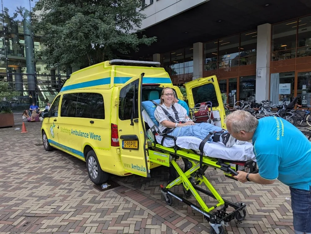 ‘Met verlof gaan was geen optie,’ schrijft ze, ‘maar binnen 24 uur stond er ineens een heel team klaar.’ Dankzij Stichting Ambulance Wens kon ze tóch aanwezig zijn bij het verjaardagsfeest in Delfgauw.